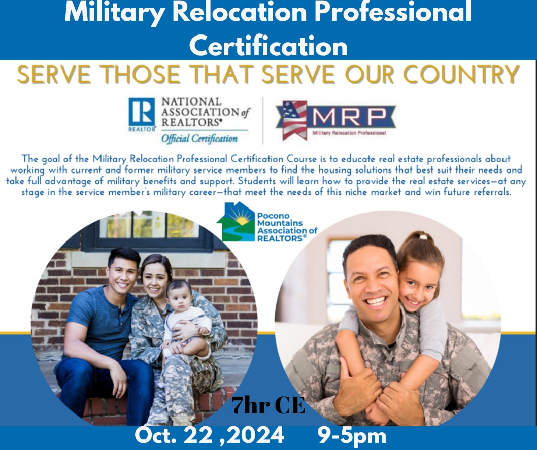 The goal of the Military Relocation Professional Certification Course is to educate real estate professionals about working with current and former military service members to find the housing solutions that best suit their needs and take full advantage of military benefits and support. Students will learn how to provide the real estate services—at any stage in the service member’s military career—that meet the needs of this niche market and win future referrals.